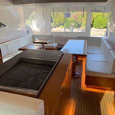 Refrigerators, an ice maker, and a retractable TV complete this area, making it perfect for entertainment and relaxation on board.